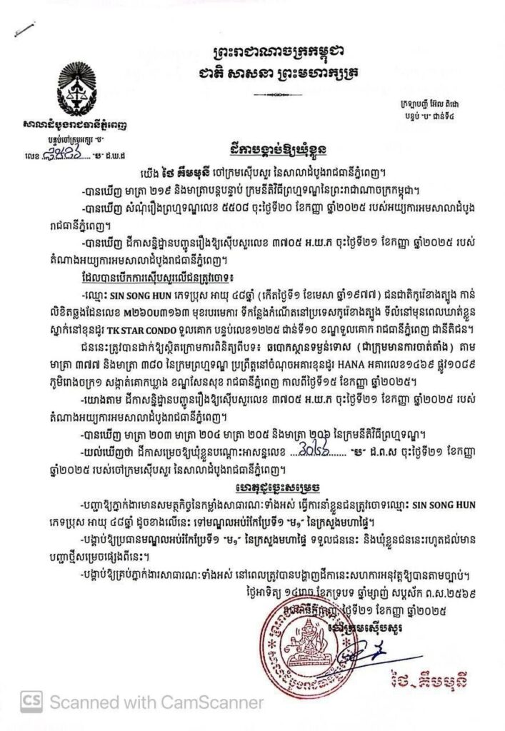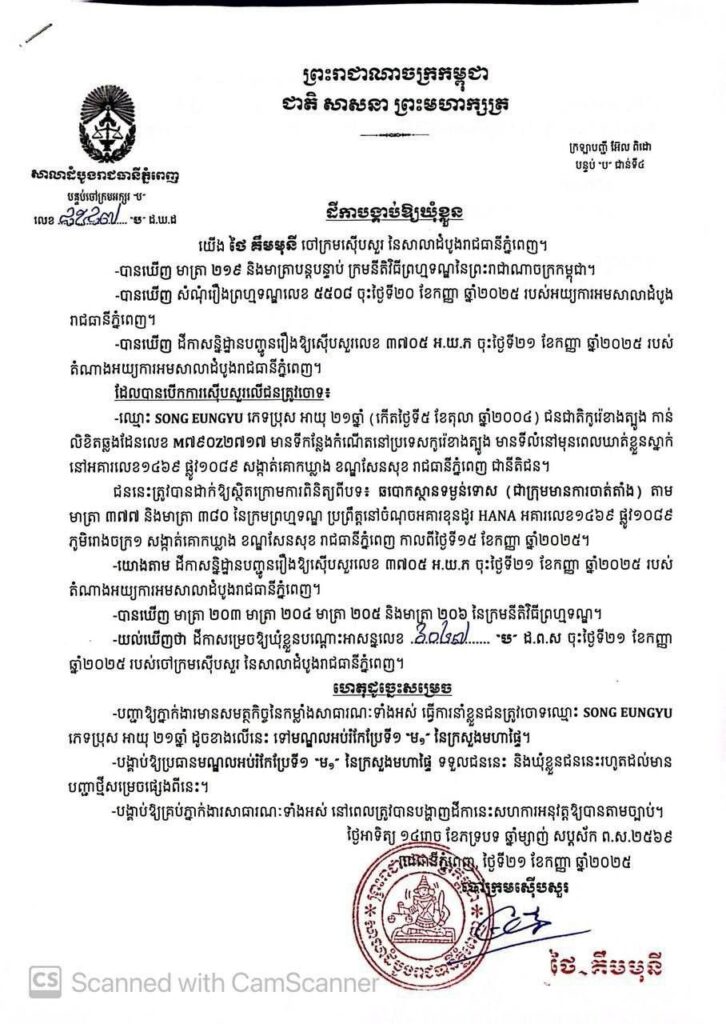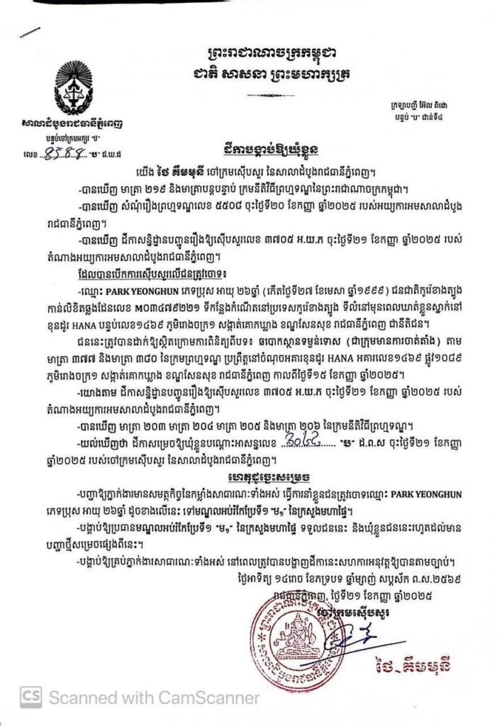 ភ្នំពេញ៖ លោកស្រី ថៃ គីមមុនី ចៅក្រមស៊ើប សួរសាលាដំបូងរាជធានីភ្នំពេញ កាលពីថ្ងៃទី២១ ខែកញ្ញា ឆ្នាំ២០២៥ បានចេញដីកា ចោទប្រកាន់ និងបង្គាប់ឱ្យឃុំខ្លួនជនជាតិកូរ៉េខាងត្បូង ចំនួន០៣នាក់ពីបទ ឆបោកមានស្ថានទម្ងន់ទោស (ជាក្រុមមានការចាត់តាំង) ទៅកាន់មណ្ឌលអប់រំកែប្រែទី១ (ម១)។នៅក្នុងដីកាផ្សេងគ្នាចំនួន៣ បានបង្ហាញថា ជនត្រូវចោទទាំងនោះ គឺទី1. ឈ្មោះ SIN SONG HUN ភេទប្រុស ទី2. ឈ្មោះ SONG EUNGYU ភេទប្រុស និងទី3. ឈ្មោះ PRAK YEONGHUN ភេទប្រុស ។ជនទាំងនេះត្រូវបានដាក់ឱ្យស្ថិតក្រោមការពិនិត្យពីបទ៖ ឆបោកស្ថានទម្ងន់ទោស (ជាក្រុមមានការចាត់តាំង) តាម មាត្រា ៣៧៧ និងមាត្រា ៣៨០ នៃក្រមព្រហ្មទណ្ឌ ប្រព្រឹត្តនៅចំណុចអគារខុនដូរ HANA អគារលេខ១៤៦៩ ផ្លូវ១០៨៩ ភូមិរោងចក្រ១ សង្កាត់គោកឃ្លាង ខណ្ឌសែនសុខ រាជធានីភ្នំពេញ កាលពីថ្ងៃទី១៥ ខែកញ្ញា ឆ្នាំ២០២៥។ ចំណែក ជនសង្ស័យ ៣៣ នាក់ ផ្សេងទៀត ត្រូវបានអនុវត្តន៍បណ្តេញចេញពីប្រទេសកម្ពុជា ក្នុងនោះ ជនជាតិកូរ៉េខាងត្បូង ចំនួន ៣១ នាក់ (ស្រី៥នាក់) , ជនជាតិនេប៉ាល់ ចំនួន ១នាក់ (ប្រុស) និងជនជាតិបង់ក្លាដេស ចំនួន ១នាក់ (ប្រុស)។ សូមរម្លឹកថា កាលពីថ្ងៃទី១៥ ខែកញ្ញា ឆ្នាំ២០២៥ សមត្ថកិច្ចបានឃាត់ខ្លួន ជនសង្ស័យ សរុបចំនួន៤៨នាក់ (ស្រី១០នាក់) មាន៤សញ្ជាតិ ក្នុងនោះ ជនជាតិកូរ៉េខាងត្បូង ចំនួន ៣៣នាក់ (ស្រី៥នាក់) ជនជាតិនេប៉ាល់ ចំនួន ១នាក់ (ប្រុស) ជនជាតិបង់ក្លាដេស ចំនួន ១នាក់ (ប្រុស) ជនជាតិខ្មែរ ចំនួន ១៣នាក់ (ស្រី៥នាក់) ផងដែរ។ ក្រៅពីនេះ ក្រុមប្រតិបត្តិការក៏បានរឹបអូស សម្ភារៈបម្រើឱ្យការប្រព្រឹត្តបទល្មើសឆបោកតាមប្រព័ន្ធបច្ចេកវិទ្យា(Online Scam ) រួមមាន កុំព្យូទ័រ ចំនួន ៦០គ្រឿង ទូរដែក ចំនួន ៣ គ្រឿង និងលិខិតឆ្លងដែន សរុបចំនួន ៣៥ច្បាប់ ។សូមរំលឹកជូនថាបើគិតចាប់ពីថ្ងៃទី២៧ ខែមិថុនា ឆ្នាំ២០២៥ ដល់ថ្ងៃទី២១ ខែកញ្ញា ឆ្នាំ២០២៥នេះ គណៈបញ្ជាការឯកភាពរដ្ឋបាលរាជធានី ខេត្ត ក្រោមការចង្អុលបង្ហាញពីគណៈកម្មការចំពោះកិច្ចប្រយុទ្ធប្រឆាំងការឆបោកតាមប្រព័ន្ធបច្ចេកវិទ្យា ហៅកាត់ថា គ.ប. ឆ.ប. បានចាត់វិធានការបង្ក្រាប និងបានឃាត់ខ្លួនជនសង្ស័យសរុបចំនួនប្រមាណ ជាង៣០០០នាក់ ភាគច្រើនជាជនបរទេស។ នៅក្នុងយុទ្ធនាការបង្ក្រាបសកម្មភាពឆបោកអនឡាញក្នុងនោះដែរសមត្ថកិច្ចបានចាត់វិធានការបញ្ជូនមុខសញ្ញាសង្ស័យជាមេខ្លោងចំនួន៦៩នាក់ និងបក្ខពួករបស់ពួកគេទៅតុលាការដើម្បីចាត់វិធានការតាមនីតិវិធីច្បាប់ជាធរមាន ខណៈជនបរទេសពាក់ព័ន្ធការឆបោកតាមប្រព័ន្ធបច្ចេកវិទ្យា(Online Scam)សរុបប្រមាណជាង ២៤០០នាក់ត្រូវបាននិរទេសចេញពីកម្ពុជា។ សូមបញ្ជាក់ថា រាជរដ្ឋាភិបាលកម្ពុជា កាលពីថ្ងៃទី១៤ ខែកក្កដា ឆ្នាំ២០២៥ បានដាក់ចេញ យុទ្ធនាការបោសសម្អាតការឆបោកតាមប្រព័ន្ធបច្ចេកវិទ្យានៅទូទាំងប្រ