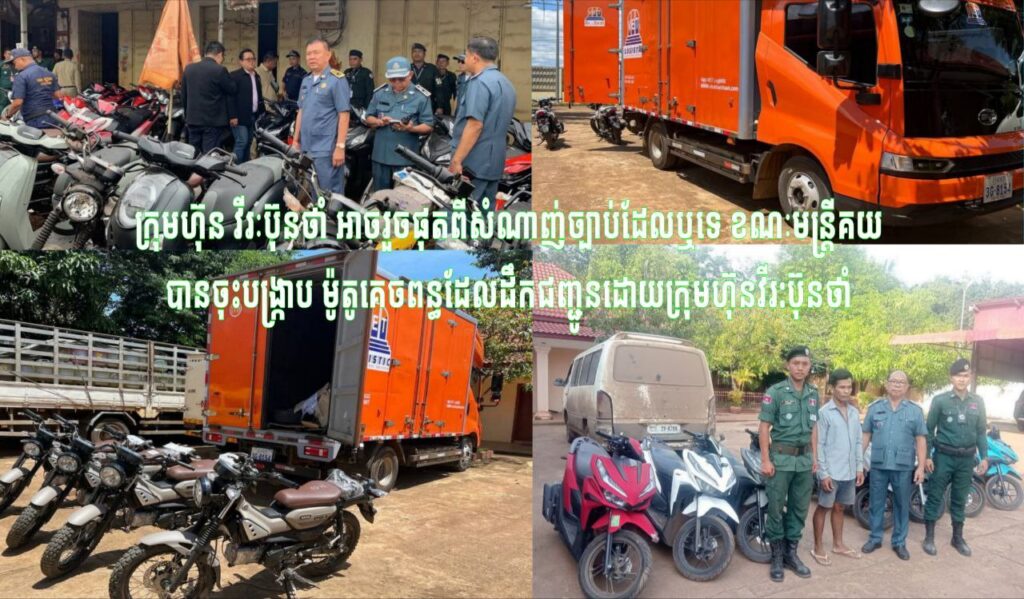 ក្រុមហ៊ុន វីរ:ប៊ុនថាំ ដែលជាក្រុមហ៊ុនមានឈ្មោះបោះសម្លេង កំពុងក្លាយខ្លួន ជាក្រុមហ៊ុន ដឹកជញ្ជូន ម៉ូតូគេចពន្ធ ខុសច្បាប់ នេះបើយោង តាមបណ្តាញផ្សព្វផ្សាយព័ត៌មានសង្គម ក្នុងស្រុក និងយោងតាមរបាយការណ៍របស់មន្ត្រីគយ តើស្ថាប័នពាក់ព័ន្ធចាត់វិធានការយ៉ាងណា ចំពោះ ក្រុមហ៊ុន វីរ:ប៊ុនថាំ ។