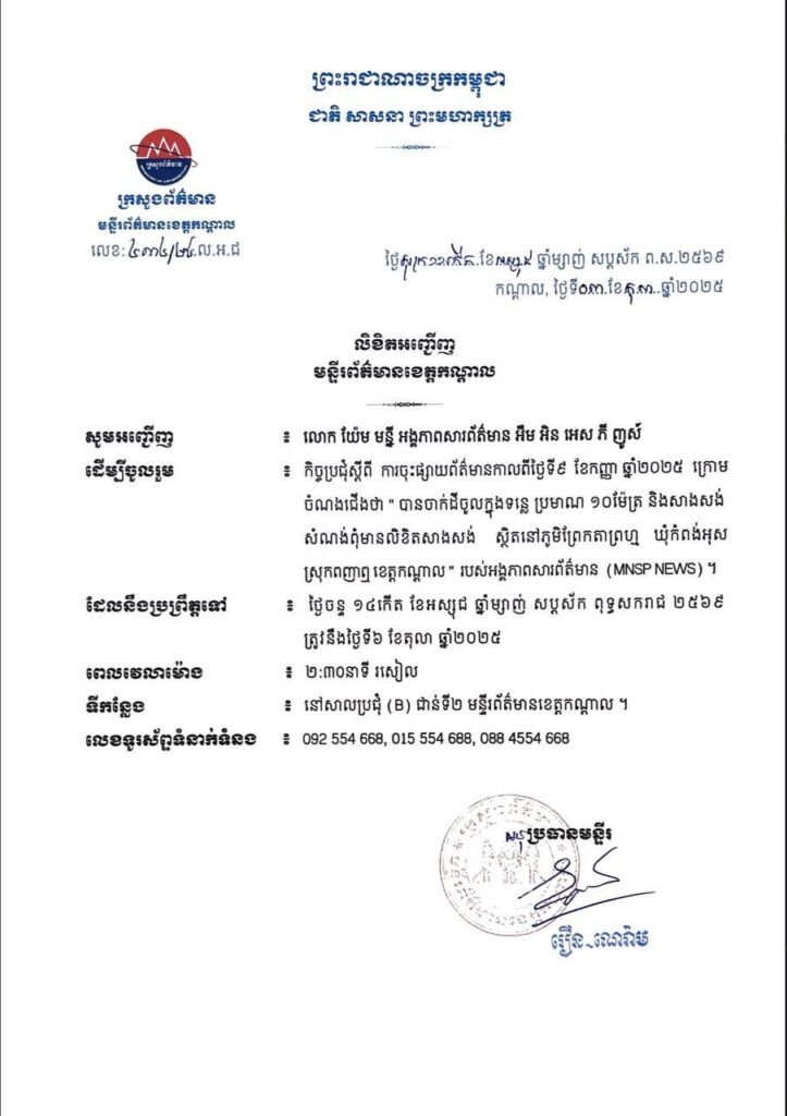 ក្នុងនាមជាអ្នកសារព័ត៌មាន ប្រកបដោយវិជ្ជាជីវ:ព្យាយាម សុំការបំភ្លឺពីមន្ត្រី អាជ្ញាធរសមត្ថកិច្ចនិងស្ថាប័នពាក់ព័ន្ធ ដើម្បីស្រាយបំភ្លឺ កុំអោយមានការភាន់ច្រឡំ នៅក្នុងនោះមន្ទីរព័ត៌មានខេត្តកណ្តាលចេញលិខិតលេខ ៤៣៤/២៥លអជ ចុះនៅថ្ងៃទី៣ខែតុលាឆ្នាំ២០២៥ បានធ្វើលិខិតអញ្ជើញ លោក ញ៉ែម មន្នី អង្គភាពសារព័ត៌មាន អឹម អិន អេស ភី ញូស៍ ដែលបានចុះផ្សាយព័ត៌មាននៅថ្ងៃទី៩ខែកញ្ញាឆ្នាំ២០២៥ ទាក់ទិកទៅនិងករណីខាងលើ ដែលសារព័ត៌មានបានផ្សព្វផ្សាយ លោក រឿន ណេរ៉ាម ជាអនុប្រធានមន្ទីរព័ត៌មានខេត្តកណ្តាល ។