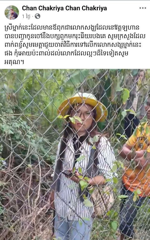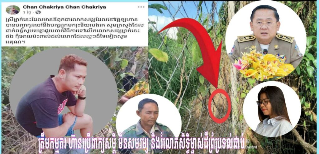 បើយោងតាមការផុស ទៅលើបណ្តាញសង្គម អាខោនហ្វេសប៊ុករបស់ ឈ្មោះ CHAN CHAKRIYA ក្នុងនាមជាកម្មករ ប្រើពាក្យមិនសមរម្យ មកលើម្ចាស់ដីដែលមានព្រំប្រទល់ជាប់គ្នាមិនតែប៉ុណ្ណោះយកឈ្មោះឪពុករបស់ប្អូនស្រី វឿន ឈុន ដែលលោក បានបួសជាព្រះសង្ឃ មកប្រមាថ ទៅលើបណ្ដាញសង្គម ដែលធ្វើអោយមានផលប៉ះពាល់យ៉ាងធ្ងន់ធ្ងរ សូមថ្នាក់ដឹកនាំគ្រប់ជាន់ថ្នាក់ ជួយពិនិត្យបុគ្គលម្នាក់នេះតាមការគួរ។