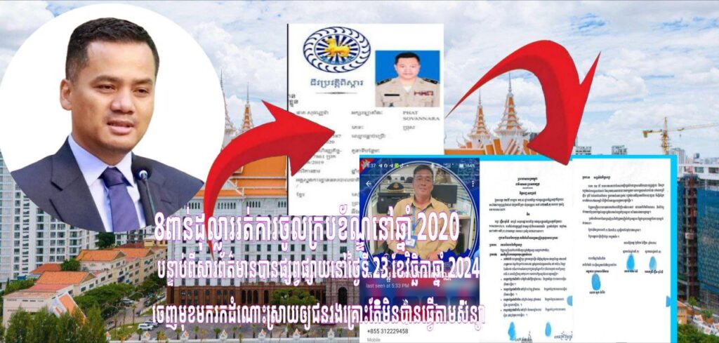 រាជធានីភ្នំពេញ: បន្ទាប់ពីជនរងគ្រោះស្នើសុំ មកអង្គភាពអ្នកសារព័ត៌មានយើង នៅថ្ងៃទី២១ខែវិច្ឆិកាឆ្នាំ២០២៤ កន្លងមក ក្នុងការស្នើសុំ ដល់លោកឧត្តមសេនីយ៍ត្រីម្នាក់ បំរើការងារ អគ្គស្នងការដ្ឋាន នគរបាលជាតិ ស្នងការដ្ឋានហិរញ្ញកិច្ចនិងភស្ភុភារ ជួយដោះស្រាយ សងលុយក្នុងករណីរត់ការចូលក្របខ័ណ្ឌ នៅក្នុងឆ្នាំ២០២០ ។