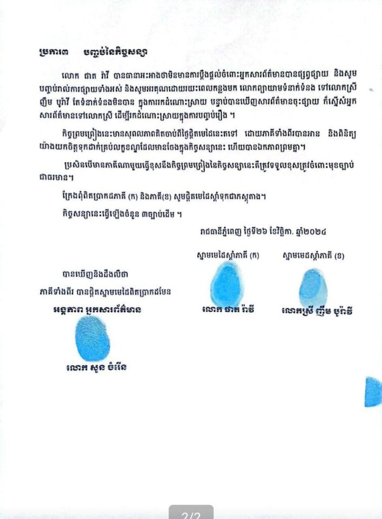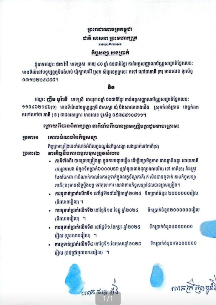 កិច្ចសន្យាសងប្រាក់ ក្នុងនាមមិត្តភាពជនរងគ្រោះព្រមទទួលតែ៦000 USD (ប្រាំមួយពាន់ដុល្លារអាមេរិក) ហើយប្រាក់(ប្រាំមួយពាន់ដុល្លារអាមេរិក)នោះ តាមសុំណើររបស់ លោកផាត រ៉ាវី សុំទូទាត់៤ដំណាក់កាល លើកទី១សងចំនួនពីរលានរៀល នៅថ្ងៃទី ២៥ខែវិឆ្ឆិកាឆ្នាំ២០២៤ លើកទី២សងចំនួនពីរលានរៀល នៅថ្ងៃទី ១៥ខែធ្នូឆ្នាំ២០២៤លើកទី៣ចំនួនសងបួនលានរៀល នៅថ្ងៃទី ១ខែកុម្ភ:ឆ្នាំ២០២៥និងលើកទី៤ចំនួនសងដបប្រាំមួយលានរៀល នៅថ្ងៃទី ១ខែមេសាឆ្នាំ២០២៥កិច្ចសន្យាមួយនេះ បានធ្វើនៅភ្នំពេញថ្ងៃទី២៤ខែវិច្ឆិកាឆ្នាំ២០២៥ ក្រោយពីសារព័ត៌មានបានចេញផ្សាយ ។