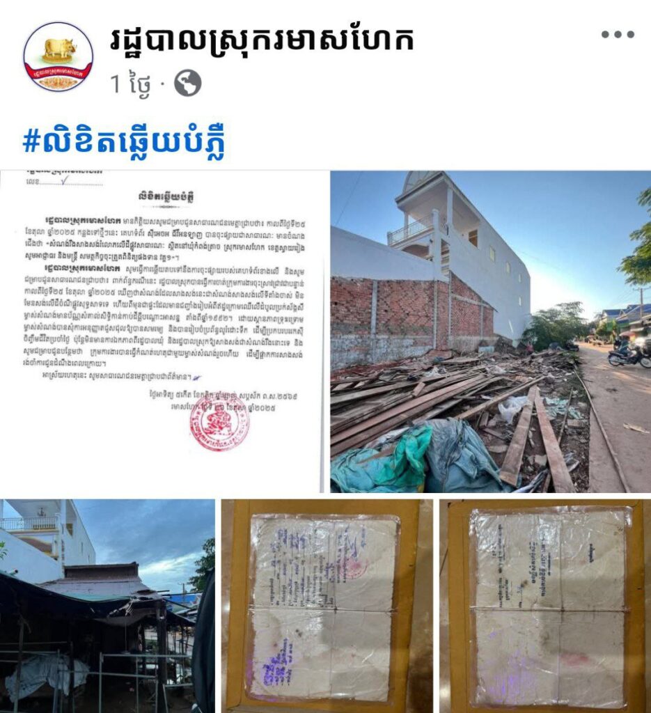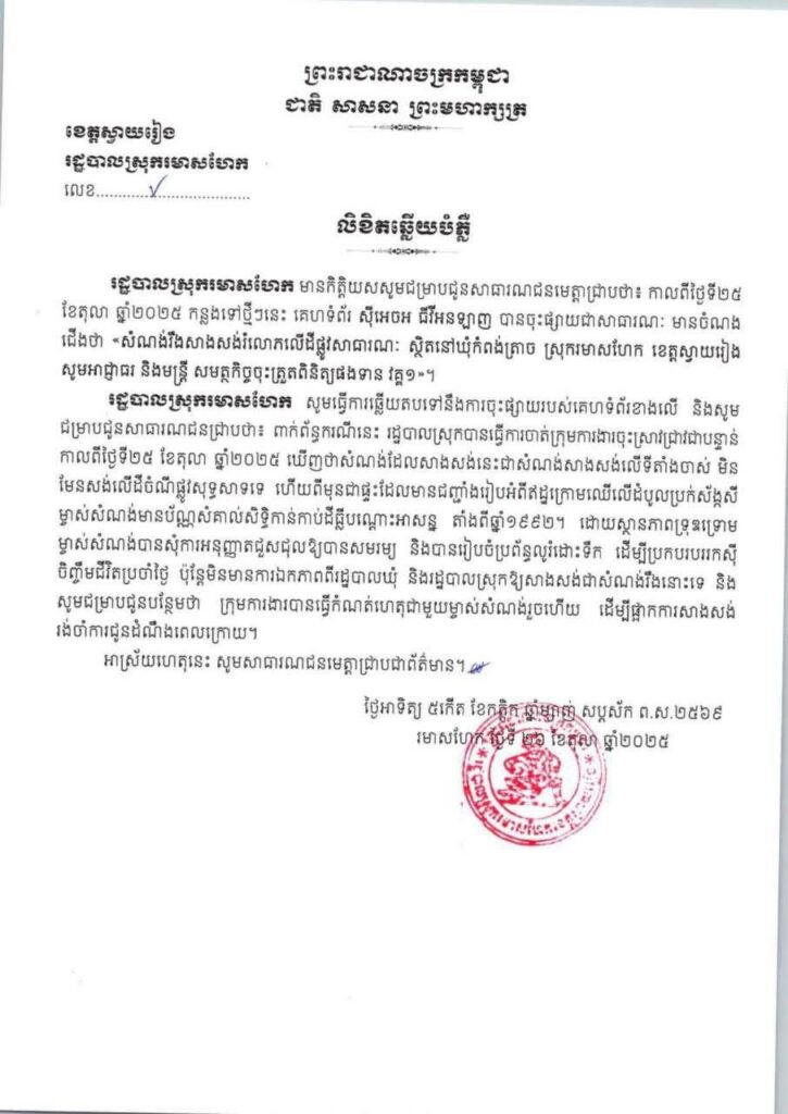 ស្រុករមាសហែកខេត្តស្វាយរៀង បានចេញលិខិតឆ្លើយបំភ្លឺ ដែលមានខ្លឹមសារទាំងស្រុង