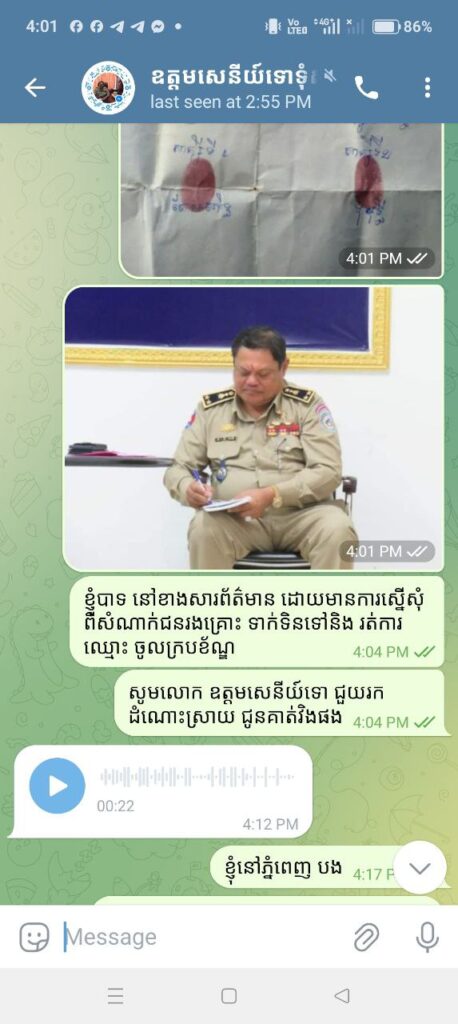 ខេត្តកំពត÷បន្ទាប់ពីប្រជាពលរដ្ឋជនរងគ្រោះស្នើសុំមកអង្គភាពអ្នកសារព័ត៌មាននៅថ្ងៃទី២១ខែវិច្ឆិកាឆ្នាំ២០២៤កន្លងទៅ និងមានការផ្សាយជាសាធារណ:នៅថ្ងៃទី២៣ខែវិច្ឆិកាឆ្នាំ២០២៤ រួចម្តងហើយទៅលើបណ្តាញទំនាក់ទំនងសង្គម ក្នុងការស្នើសុំ ដល់លោកឧត្តមសេនីយ៍ទោ ទុំ សុទ្ធី ហៅ(ធូ )អតីតស្នងការរងខេត្តកំពត និង ជាអនុប្រធាននាយកដ្ឋានកិច្ចការប៉ុស្តិ៍រដ្ឋបាលស្នងការដ្ឋាននគរបាលជាតិនាពេលបច្ចុប្បន្ន រួមទាំង លោក អូន ណារិទ្ធ ហៅ(ដា)ដែលបានអះអាងថា ធ្វើការ កងអង្គភាពការពារផ្ទាល់សម្តេចនាយករដ្ឋមន្ត្រី កាលពីឆ្នាំ២០១៥ ។