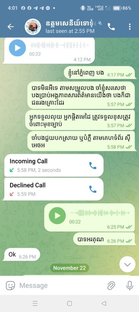 លោក ញឹមប្រុស អាយុ៥៤ឆ្នាំ បច្ចុប្បន្នរស់នៅភូមិ ដាសស្ករ ឃុំបឹងសាលាខាងជើង ស្រុកកំពង់ត្រាចខេត្តកំពតបានស្នើសុំដល់អង្គភាពសារព័ត៌មានយើងជួយផ្សព្វផ្សាយសារជាថ្មី នៅថ្ងៃទី៣០ខែតុលាឆ្នាំ២០២៥ បានធ្វើបទសម្ភាសន៍តាមរយ:ទូរស័ព្ទរបស់ជនរងគ្រោះ បានរៀបរាប់ដោយទុក្ខក្រៀមក្រំ ពីព្រោះនៅពេលបច្ចុប្បន្ន នេះរូបលោក មិនមានលុយ ក្នុងការផ្គត់ផ្គង់ជីវភាពគ្រួសារ ដោយសារលុងជឿ សំដី លោក អូន ណារិទ្ធហៅ(ដា)ដែលធ្វើការនៅកងអង្គរក្ស និងលោកឧត្តមសេនីយ៍ទោ ទុំ សុទ្ធី ហៅ(ធូ) ដែលបានបញ្ជាក់ពីតួនាទី យោងតាមឯកសារ ទទួលប្រាក់ពីលោក ចំនួន៤,០០០USD(បួនពាន់ដុល្លារអាមេរិក) ជាថ្នូរក្នុងការរត់ការឈ្មោះចូលក្របខ័ណ្ឌរដ្ឋ នៅក្នុងអំឡុងឆ្នាំ២០១៥និងបង់ប្រាក់នៅក្នុងអំឡុងឆ្នាំ២០១៦ ចំនួន១,០០០ USD (មួយពាន់ដុល្លារអាមេរិកបន្ថែមទៀត ព្រមទាំងថ្ងៃបាយ២តុ) មកដល់ពេលបច្ចុប្បន្ននេះគម្រប់ខួប១០ឆ្នាំល្មម ។