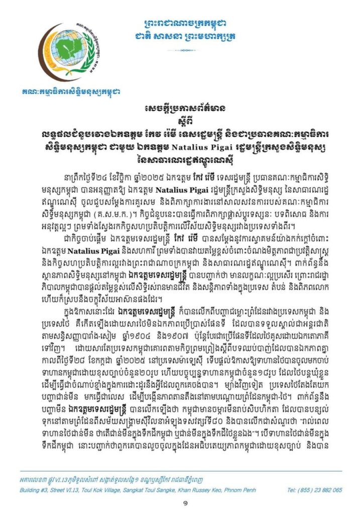 បន្ទាប់ពីបានទទួលស្តាប់នូវការលើកឡើងខាងលើ លោក Natalius Pigai បានថ្លែងអំណរគុណចំពោះ លោកទេសរដ្ឋមន្ត្រី នូវព័ត៌មានទាំងអស់ និងការចំណាយពេលវេលាដ៏មមាញឹក អនុញ្ញាតឱ្យលោកនិងសហការី បានចូលជួបសម្តែងការគួរសម និងពិភាក្សាការងារ។ លោករដ្ឋមន្ត្រី បានកោតសរសើរពីកិច្ចខិតខំរបស់ គ.ស.ម.ក. ក្នុងការលើកកម្ពស់ និងការពារសិទ្ធិមនុស្សនៅកម្ពុជា ហើយក៏ បានកត់សម្គាល់ថា បច្ចុប្បន្នកម្ពុជាមិនត្រឹមតែបញ្ជូនពលករទៅធ្វើការនៅក្រៅប្រទេសប៉ុណ្ណោះទេ ប៉ុន្តែកម្ពុជា ក៏ជាប្រទេសទទួលពលករបរទេសមកធ្វើការនៅក្នុងប្រទេសកម្ពុជា រួមទាំងពលករមកពីប្រទេសឥណ្ឌូណេស៊ី ផងដែរ។