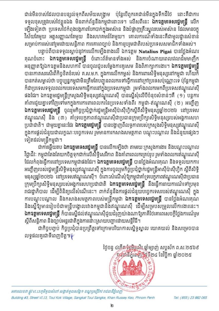 ជាការឆ្លើយតប លោកទេសរដ្ឋមន្ត្រី បានលើកឡើងថា តាមរយៈក្រសួងការងារ និងបណ្តុះបណ្តាល វិជ្ជាជីវៈ កម្ពុជាតែងតែយកចិត្តទុកដាក់លើសិទ្ធិសេរីភាព និងគាំពារពលករគ្រប់រូប រួមទាំងពលករឥណ្ឌូណេស៊ី ដែលកំពុងធ្វើការនៅប្រទេសកម្ពុជាផងដែរ។ លោកទេសរដ្ឋមន្ត្រី បានថ្លែងអំណរគុណ និងទទួលយកការអញ្ជើញរបស់រដ្ឋមន្ត្រីសិទ្ធិមនុស្សឥណ្ឌូណេស៊ី ក្នុងការចូលរួមកិច្ចប្រជុំថ្នាក់រដ្ឋមន្ត្រីអាស៊ីប៉ាស៊ីហ្វិក ស្តីពីសិទ្ធិមនុស្សឆ្នាំ២០២៦ នៅប្រទេសឥណ្ឌូណេស៊ី។ ចំពោះសំណើសុំឱ្យកម្ពុជាគាំទ្របេក្ខភាពឥណ្ឌូណេស៊ីជាប្រធានក្រុមប្រឹក្សាសិទ្ធិមនុស្សរបស់អង្គការសហប្រជាជាតិ លោកទេសរដ្ឋមន្ត្រី នឹងធ្វើការរាយការណ៍ទៅប្រមុខរាជរដ្ឋាភិបាល ដើម្បីពិនិត្យលើសំណើនេះ៕