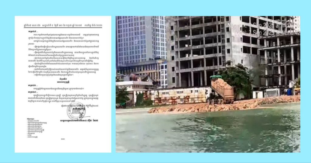 ខេត្តព្រះសីហនុ៖ នៅថ្ងៃទី០៩ ខែកញ្ញាឆ្នាំ២០២៥ក្រុមការងារអង្គភាពសារព័ត៌មានយើងបានទទួល ដំណឹងមានករណីចាក់ដីចូលច្រាំងសមុទ្រដែលមានទីតាំង ស្ថិតនៅក្នុងភូមិ១ សង្កាត់លេខ៣ក្រុងព្រះ សីហនុ ខេត្តព្រះសីហនុក្រោយពីបានទទួលព័ត៌មាន ក្រុមការងារសារព័ត៌មានយើងជាច្រើនអង្គភាព បានចុះដល់ទីតាំងខាងលើផ្ទាល់និងបានផ្តិតយករូបភាពទិដ្ឋភាពទីតាំងខាងលើ និងសូមធ្វើសេចក្តីរាយការណ៍ជូនថ្នាក់ដឹកនាំគ្រប់ជាន់ថ្នាក់ សូមមេត្តាចាត់វិធានការទប់ស្កាត់ ដោយក្តីអនុឡគ្រោះ ។